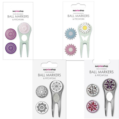 Surprizeshop Divot Tool and 3 Hand Enameled Golf Ball Markers. Daisy, Crystal or Lace